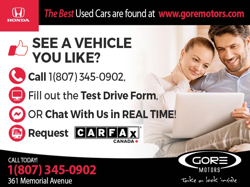 Gore Motors Honda presents “Market Value Pricing!”. Using state-of-the-art internet software, we are able to provide Real-Time Market Value Pricing on all of our Pre-Owned vehicles. We offer competitive market prices for the best quality used vehicles, and Financing is available. Come see our great selection of quality used vehicles in Thunder Bay, Ontario, and experience the Gore Motors difference for yourself.